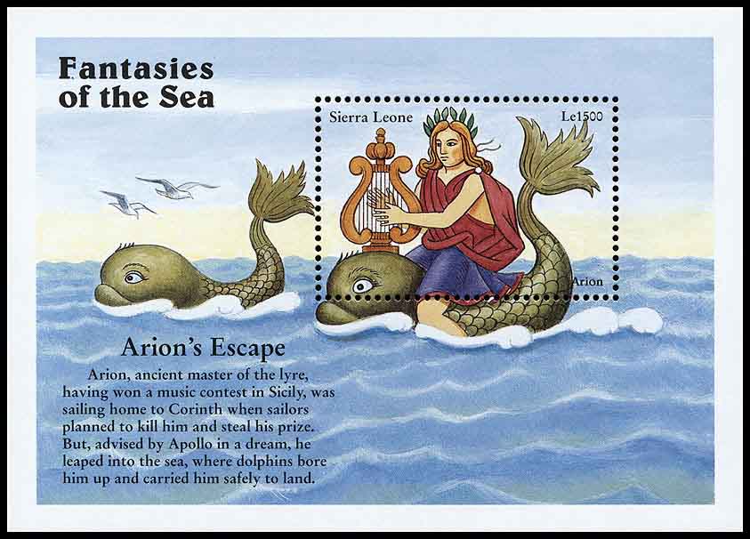 Арион, древний властитель лиры, выиграв музыкальное соревнование в Сицилии, плыл домой в Коринф, когда моряки решили убить его и украсть его награду. Но, во сне предупреждённый Аполлоном, Арион прыгнул в море, где дельфины подхватили его и благополучно отнесли к земле».
