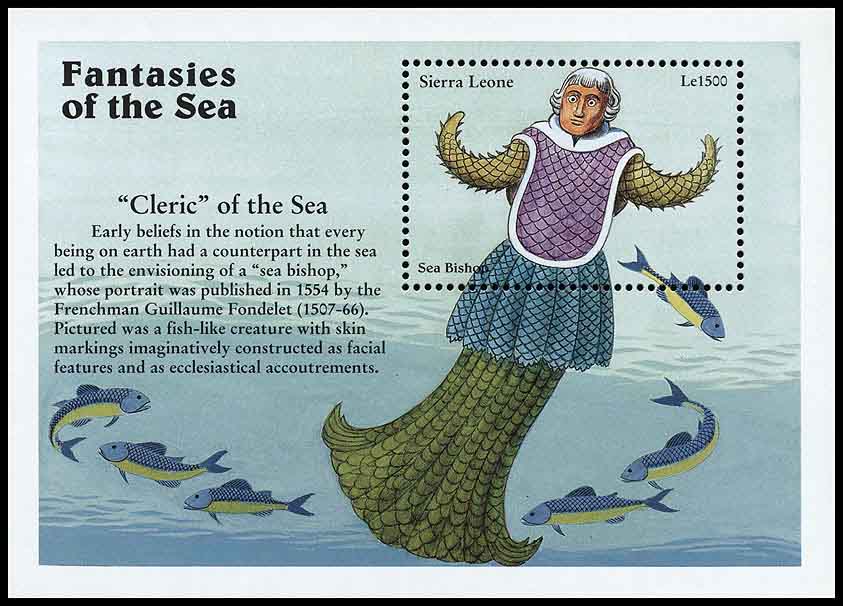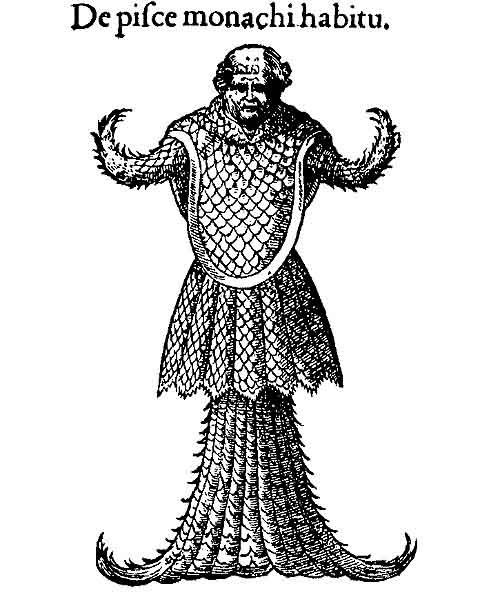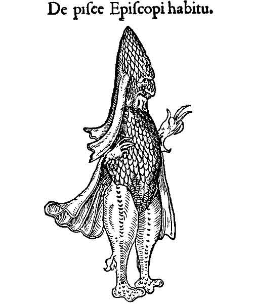 Ранние убеждения в том, что у каждого существа на земле был двойник в море, привели к предположению о „морском епископе“, изображение которого было издано в 1554 французом Гийомом Фонде (1507—1566). Изображённое существо было подобно рыбе, с окраской шкуры, похожей на черты лица и на церковные одеяния».