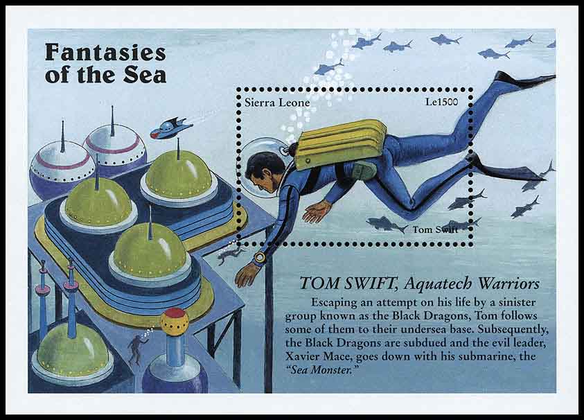 На тридцатом блоке рисунок к научно-фантастической книге «Акватех воины», впервые изданной в 1991 году и вышедшей в серии о приключениях Тома Свифта. Автором книг указан Виктор Апплетон, под этим псевдонимом пишут многие «литературные негры». Настоящие авторы книги «Акватех воины» — американский писатели Джеймс Д. Макдональд и его жена Дебра Дойл. Джеймс Д. Макдональд был лауреатом фантастических премий «Mythopoeic Fantasy Award for Children’s literature» (1991) и «Best Young-Adult Science Fiction» (1997). Текст на поле блока: