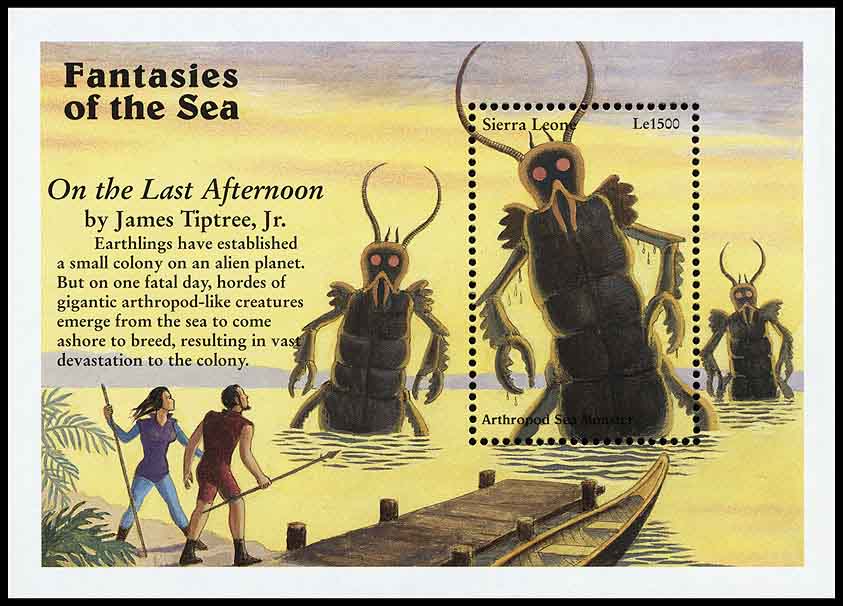 Рисунок тридцать седьмого блока к научно-фантастической повести Джеймса Типтри-младшего «В последний день», впервые опубликованной в американском фантастическом журнале «Amazing» в ноябре 1972 года. Джеймс Типтри-мл. — псевдоним американской писательницы Элис Бредли Шелдон. Джеймс Типтри-мл. неоднократно награждался престижными американскими премиями в области фантастики: «Hugo» (1974, 1977), «Nebula» (1973, 1976, 1977), «Jupiter» (1987), «Locus» (1984, 1986), «Science Fiction Chronicle» (1986), «World Fantasy» (1987). Кроме того, в 1991 году учреждена премия Джеймса Типтри-мл., которой награждают научно-фантастические произведения, расширяющие и исследующие роли женщины для мужчины и мужчины для женщины. Текст на поле блока: