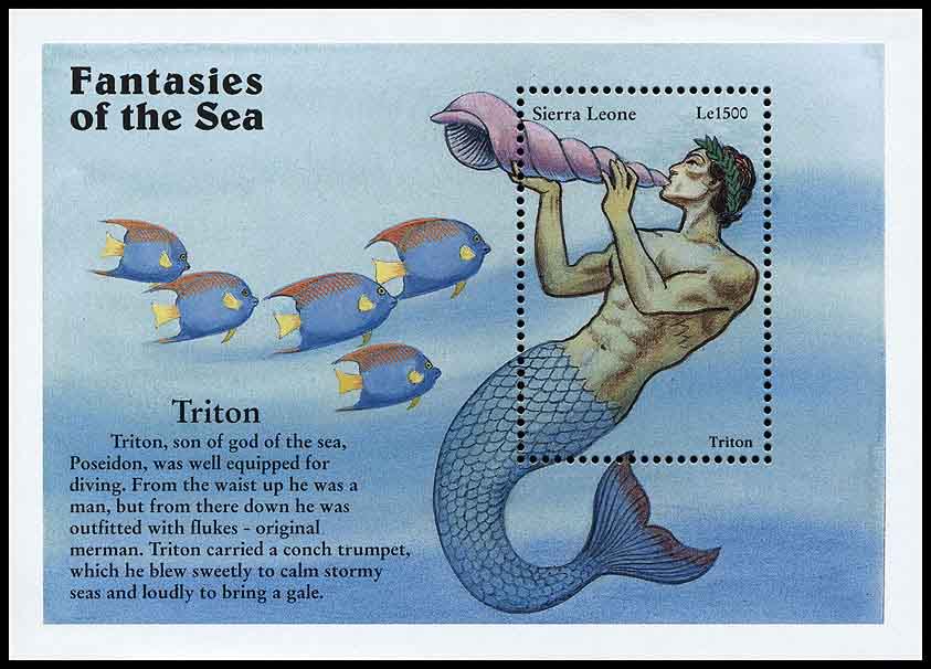 Тритон, сын морского бога Посейдона, были хорошо приспособлен для ныряния. От пояса он был человеком, а внизу он был как рыба — настоящий водяной. Тритон носил раковину-трубу, в которую сладко дул, чтобы успокоить бурные моря, и громко, чтобы вызвать шторм».