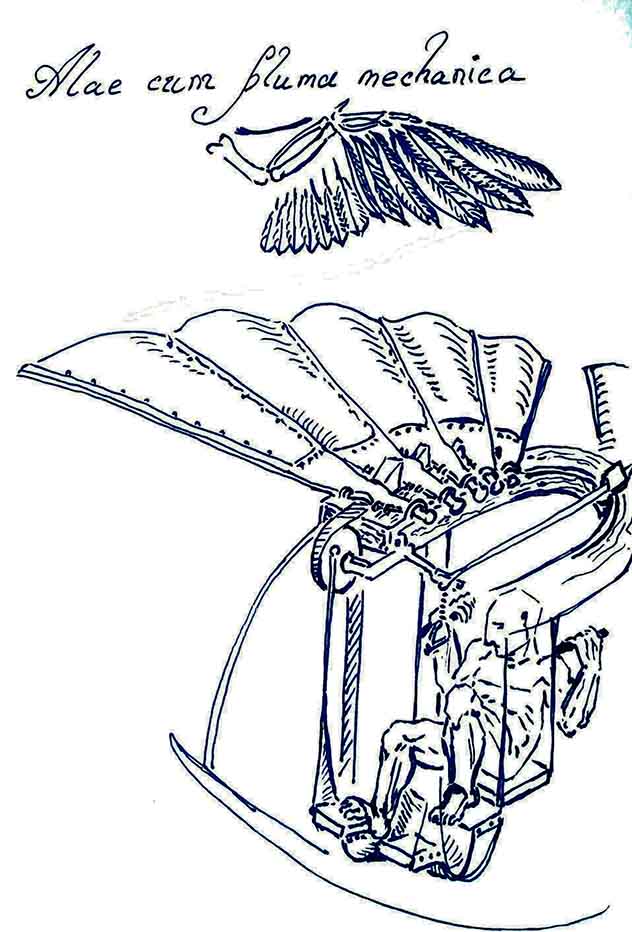 Какова роль брата Джеронимо в создании Alae cum pluma mechanica? Изучение документов эпохи позволяет с уверенностью сказать, что лопасти, способные изменять положение, впервые были изображены на пергаменте именно его рукой. Аналогия с пером птицы угадывается, хотя автор ни в одном из писем об этом не говорит. Имеет ли значение, какой именно предмет подсказал форму и движение: крыло или лепестки цветка? Францисканец живо интересовался механикой окружающего мира и мог себе позволить работу над проектом, не имевшим никакого практического значения. Теоретически конструировать приспособление для полетов он мог, но в данном случае мы имеем дело не с упражнениями пытливого ума.