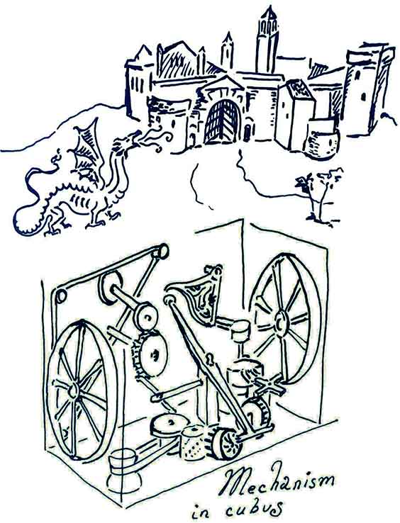 Простое происхождение брата Джеронимо, избранный им путь странствующего монаха и широкий круг знакомств не позволили бы ему дать своему изобретению неоднозначное наименование. Кто из вас, уважаемые читатели, прочтя подпись под рисунком, вспомнил ветхозаветного демона? Современники минорита с куда большим энтузиазмом искали зашифрованные имена и символы, были среди любопытных и агрессивно настроенные персоны. Отсутствие интереса к тому, как будет звучать название механизма, говорит о том, что эта страница манускрипта не предназначалась для публики. Возможно, брат Джеронимо, планируя гораздо более громоздкий и сложный механизм, упражнялся в размещении многих элементов конструкции в ограниченном пространстве. Возможно, Mechanism in cubus должен был заменить износившееся оборудование, приводившее в движение одно из хозяйственных приспособлений какого-то монастыря. Истину мы не узнаем, зато есть повод пересказать занятные истории, связанные с этим рисунком.