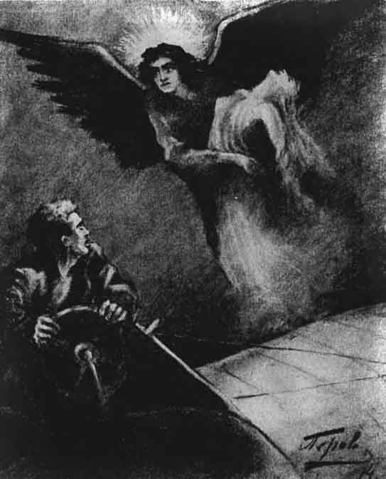 Вцепившись в колесо обеими руками, с глазами, дико устремленными вдаль, он, казалось, напрягал все силы, чтобы повернуть неподвижные рычаги… И, обнимая его шею обнаженными руками, прижималась к нему женщина в белых одеждах, с волосами, распущенными по ветру…