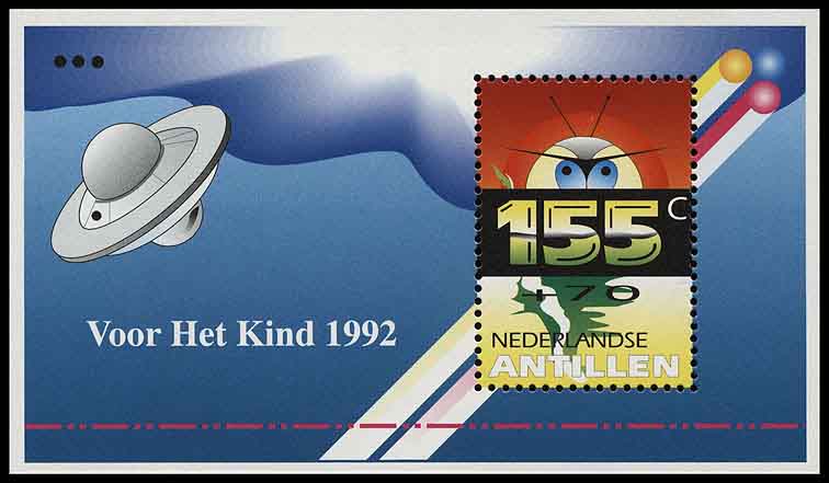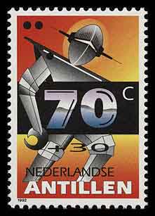 Робота-инопланетянина, прилетевшего на «летающей тарелке», можно увидеть и на марке Нидерландских Антильских островов 1992 года (Michel № 760). Марка вышла в серии, посвящённой НЛО и пришельцам.
