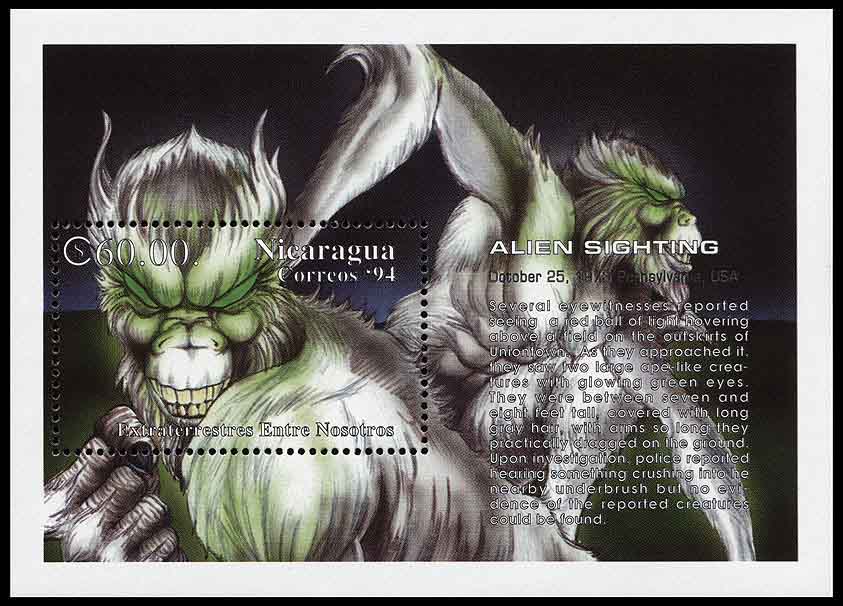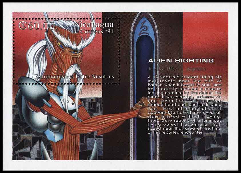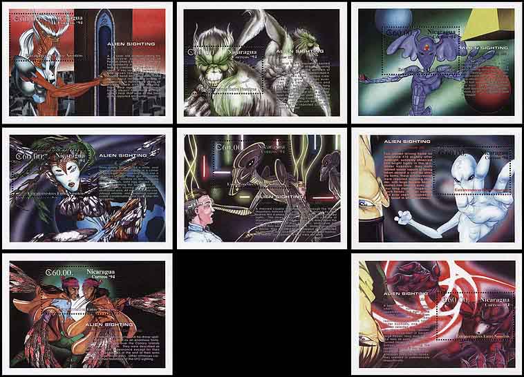Помимо этого, в 1994 году была выпущена серия из 8 почтовых блоков, посвящённая встречам с инопланетными пришельцами (Michel block № 214—221). Этот выпуск подготовлен нью-йоркским филателистическим агентством «Межправительственная филателистическая корпорация». На каждом блоке изображены инопланетные гости, а на поле приведено описание встречи с ними с указанием места и времени. Номинал каждого блока очень высокий — 60 золотых кордоба. Для сравнения: номиналы других почтовых марок, выпущенных в Никарагуа с 1991 по 2005 год включительно, не превышают 25 золотых кордоба. По всей видимости, номиналы на блоках были завышены с целью выманить больше денег у филателистов и поклонников НЛО, ведь у этих марок необычный сюжет — инопланетные пришельцы. В каталоге Michel 2007 года вся никарагуанская серия оценена в 160 евро. Как тут не вспомнить «Повесть о дружбе и недружбе» А. и Б. Стругацких: