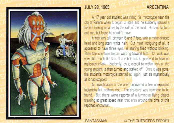 Первое, что замечаешь при сравнении двух описаний одного и того же события, — это несовпадение датировок: на блоке и карточке говорится о 28 июля 1965 года, в статье о НЛО — о 27 или 28 июля 1962 года. Как видим, ошибка в три года. Во всех других источниках, которые удалось просмотреть, также говорится о 1962 годе и описания встречи близки к описанию из статьи. Получается, что создатели голографических карточек (а вслед за ними и создатели никарагуанских блоков) весьма вольно изложили события, подсократив первоначальную историю, и добавили новые детали. Так, голова размером с арбуз превратилась в дынеобразную голову, а автомобиль превратился в мотоцикл.
