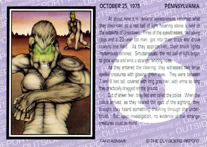 Затем они увидели двух больших обезьяноподобных существ с пылающими зелёными глазами. Существа были от 7 до 8 футов ростом, покрытые длинными седыми волосами и со столь длинными руками, что те практически доставали до земли.