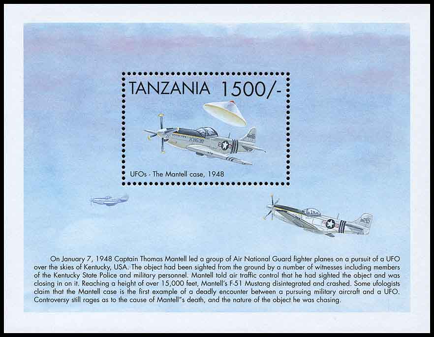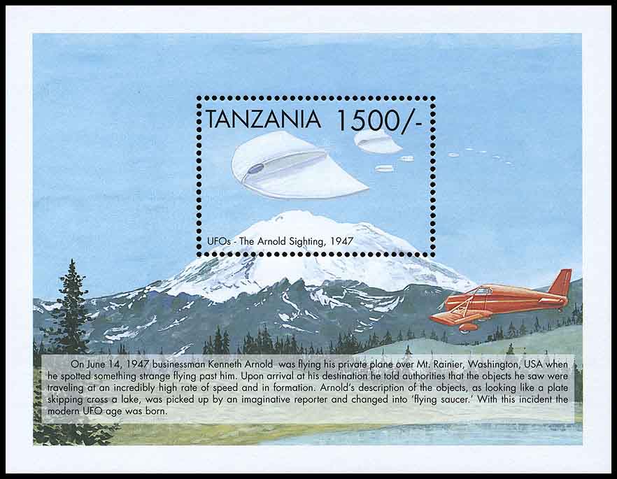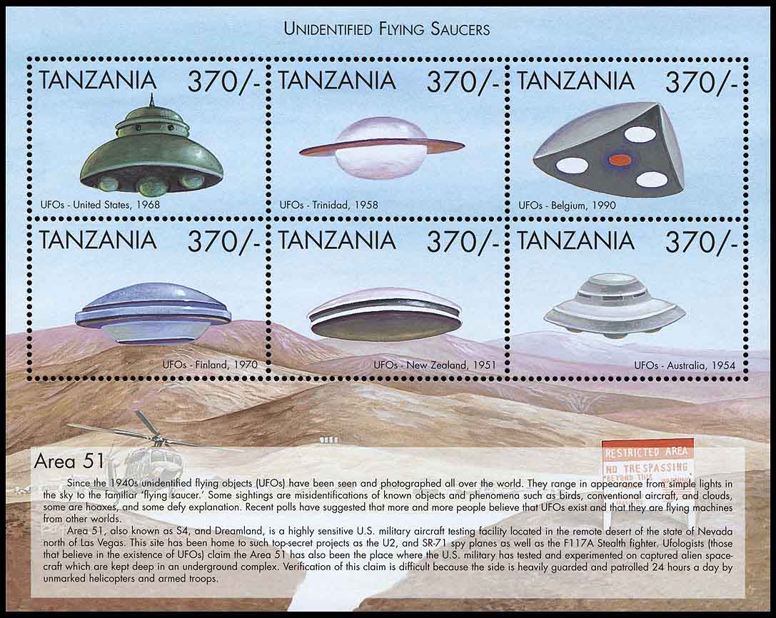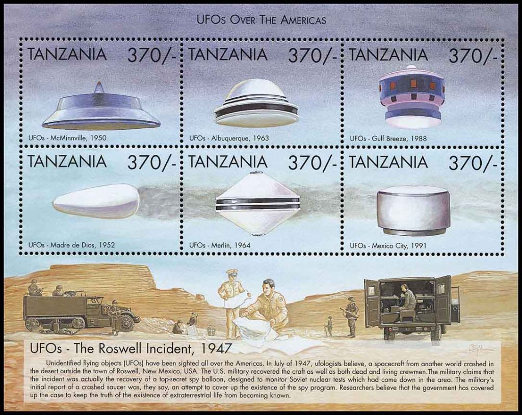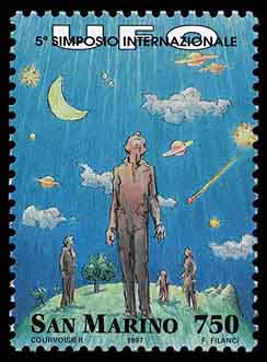 «Летающие тарелки» — не редкость в филателии. К примеру, в 1997 году в Сан-Марино в честь проходившего в этой стране пятого Международного симпозиума по НЛО и связанным с ними феноменам выпущена почтовая марка (Michel № 1715); в 1978 году в Гренаде появилась серия, состоящая из трёх марок и одного блока, посвящённая исследованию НЛО (Michel № 919—921, block № 75); в 1999 году в Танзании выпущена большая почтовая серия (12 марок и 2 блока), посвящённая НЛО (Michel № 3557—3568, block № 476—477); в 1992 году на Мальдивах появилась огромная серия (16 блоков) «Тайны Вселенной», на трёх блоках которой изображены НЛО (Michel block № 247, 249, 251), а также следы деятельности инопланетного разума.