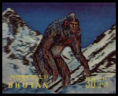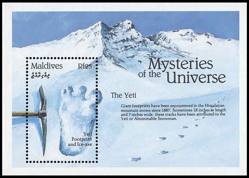Попутно отметим, что снежному человеку посвящены несколько марок. Например, на блоке Мальдив 1992 год (Michel block № 256) описана история обнаружения в Гималаях следов странного существа.