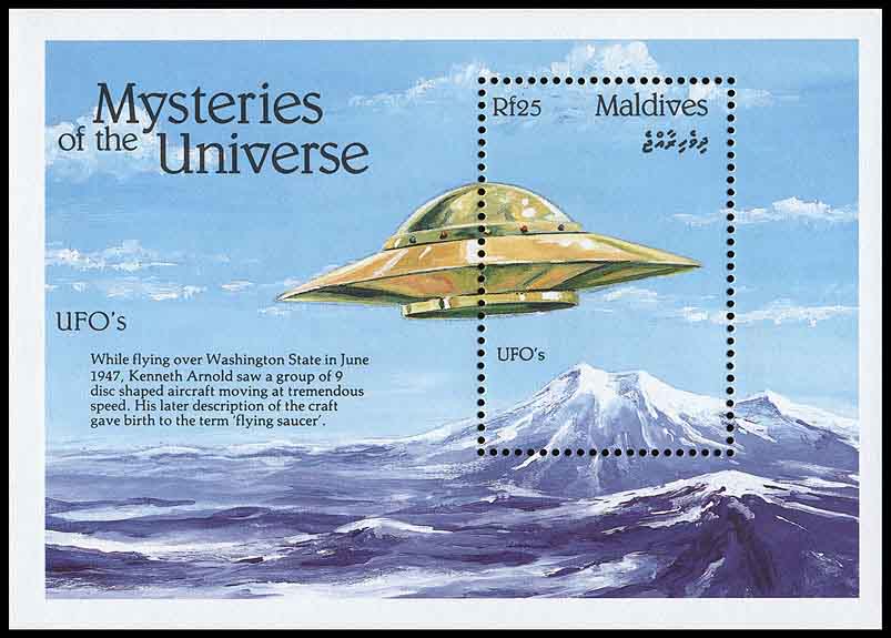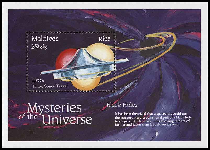 Космический аппарат, по форме напоминающий один из НЛО, — на другом мальдивском блоке, посвящённом чёрным дырам. На марке надпись: «НЛО. Время, космическое путешествие». На поле поясняющий текст: