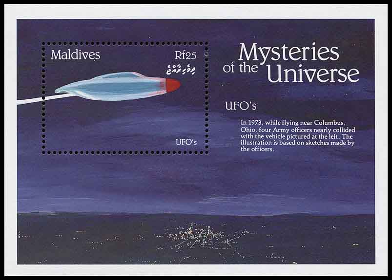 Встрече с НЛО посвящён ещё один блок мальдивской серии. Поясняющий текст на поле: