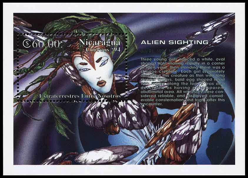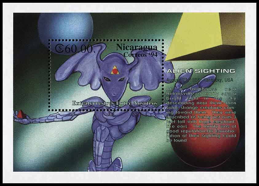 Этому почтовому блоку Никарагуа соответствует карточка № 2 из набора «(There Are) Aliens Among Us». Пересказ изложенных в ней событий: