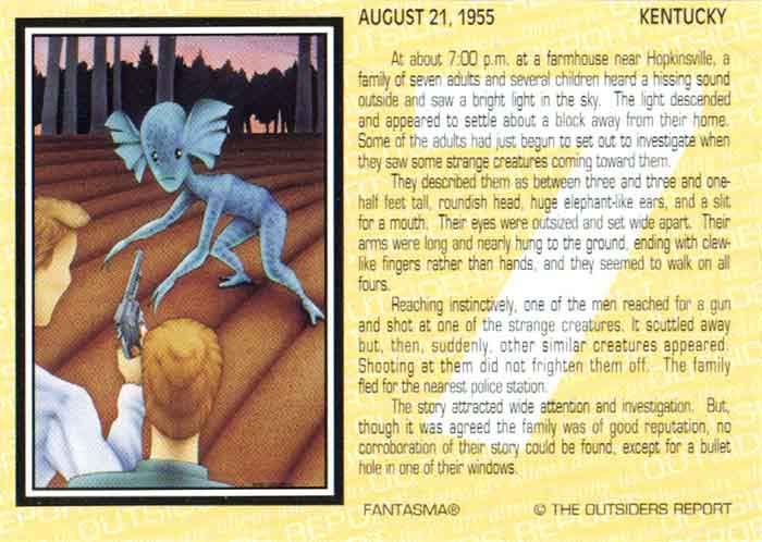 Билли Рей Тэйлор, гостивший у живущей на ферме семьи Саттонов, после наступления сумерек увидел свет, который приземлился около их дома. После этого со стороны поля приблизилось небольшое люминесцирующее существо ростом 3,5 фута. У пришельца была большая круглая и безносая голова с огромными жёлтыми пылающими глазами и оттопыренными ушами. У существа имелись длинные руки, оканчивающиеся когтистыми лапами. Руки были подняты над головой. Тело было серебристым и люминесцентным, на существе не было никакой одежды. Мужчины с расстояния 20 футов выстрелили в пришельца из дробовика и 22-калиберной винтовки; раздался звук, как будто попали в металлический предмет. Существо упало, но вновь поднялось и убежало. Когда люди вышли из дома, один из мужчин выстрелил в существо на крыше и поразил его. Одно сидело на дереве, было обстреляно и упало вниз; другое, при обходе дома, было свалено выстрелами из дробовика, но встало и убежало. Существа убегали на четвереньках и несгибавшихся ногах, но всегда приближались к дому с поднятыми руками. Рот существ никогда не открывался. После повторяющихся в течение трёх часов набегов люди направились в Хопкинсвилль, чтобы вызвать полицию.