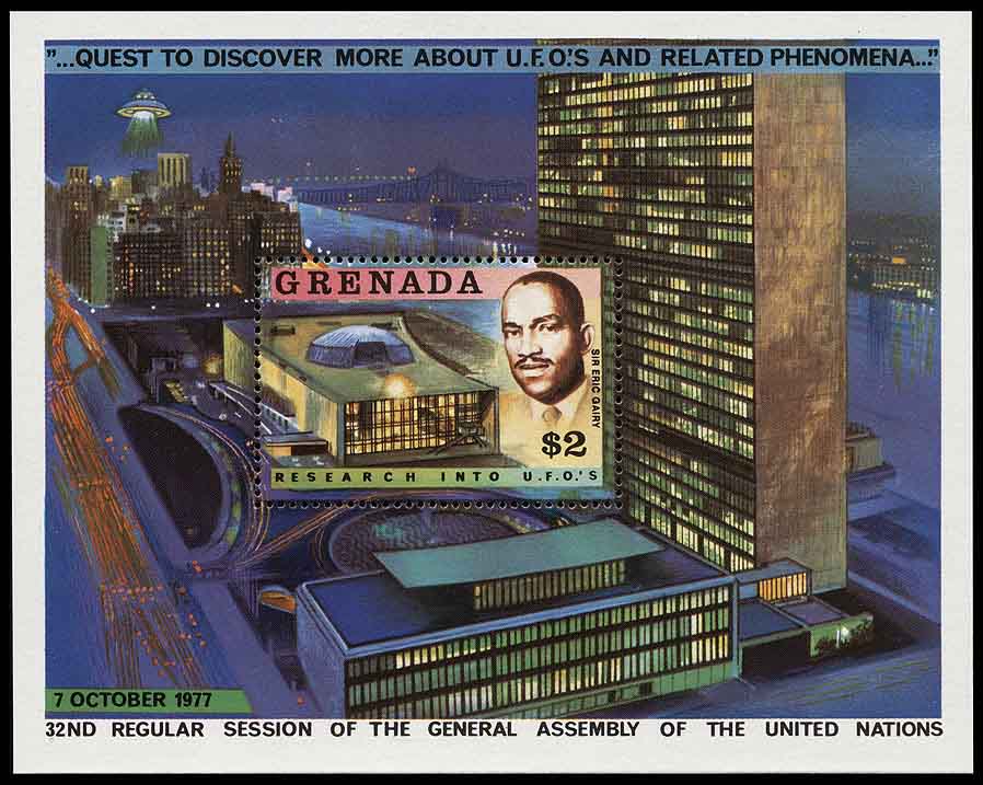 Вверху блока, на поле, приведены слова премьер-министра Гренады сира Эрика Гэри, произнесённые им 7 октября 1977 года на тридцать пятой сессии генеральной ассамблеи ООН. По просьбе Гэри и от имени его страны 14 июля 1978 года в ООН были организованы слушания по вопросу о НЛО и связанных с ними феноменов. На встрече присутствовали премьер-министр Гренады Гэри, Генеральный секретарь ООН, американский астронавт Гордон Купер, французский уфолог доктор Жак Валле, прежний консультант ВВС США, астроном и уфолог доктор Дж. Аллен Ханек и другие.