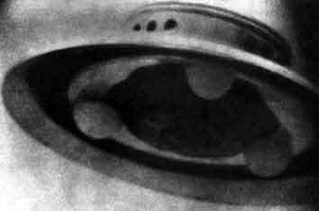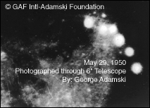 Рисунок в правой части выполнен по фотографии Джорджа Адамски, сделанной 29 мая 1950 года с помощью шестидюймового телескопа. На ней хорошо различимы светящиеся объекты на фоне Луны.