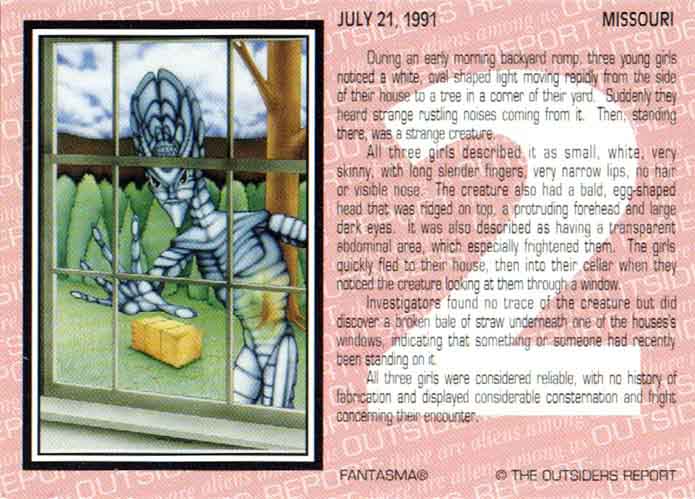 Три молодые девочки-подростка допоздна смотрели программу телевидения и пошли на задний двор, чтобы поиграть на трамплине, когда заметили белый свет овальной формы, быстро перемещающийся со стороны дома в угол заднего двора к большому дереву. Одна из девочек заметила странную гуманоидную фигуру, стоящую около трамплина. Существо было полностью белым, приблизительно четырёх футов в высоту, с тонкими длинными руками и огромной грушевидной головой, с двумя большими чёрными миндалевидными глазами. Девочки побежали в дом и попытались рассказать о происшествии старшему двоюродному брату, но он не обратил внимания на их слова и пошёл спать. Тогда девочки вернулись к себе и продолжили смотреть телевизор. Немного спустя их кот начал странно себя вести и на телевизионном экране пошли помехи. В этом момент все три девочки увидели, что тот же самый гуманоид смотрит на них через окно. Гуманоид поворачивал голову в дёргающейся механической манере. Девочки убежали в подвал, где остались до утра.