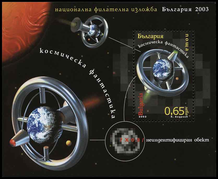 Любопытны метаморфозы и ассоциации, связанные с «летающими тарелками», на блоке «Космическая фантастика», выпущенном в Болгарии в 2003 году (Michel Block № 258). На поле блока, под маркой, располагается размытый и непонятный «неидентифицированный объект», по очертаниям схожий с НЛО. Непонятный набор символов и цифр только усиливает ощущение загадочности объекта.